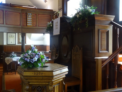 As in most parishes, the precentor role has long been abolished in Kilcalmonell. Elizabeth Ball, Sessions Clerk for the Kilcalmonell Parish, infers that "...the Precentor either used the pulpit or sat at the seat just under the pulpit on the slightly raised altar. The oval frame under the pulpit is the backing to that seat." [3] (Photo credit for above left: Elizabeth Ball.)
